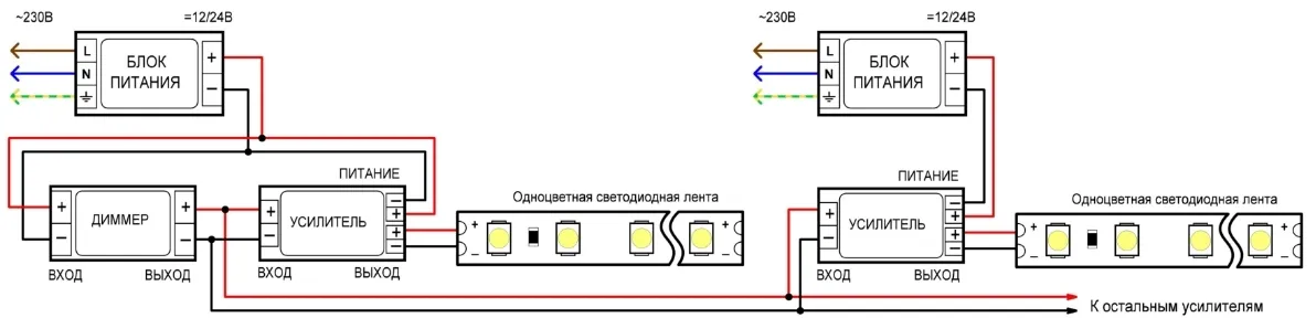 Усилители используются в том случае, если длина и мощность подключаемой ленты больше, чем мощность используемого диммера. Применив усилители, можно построить систему не с одним общим мощным блоком питания, а с несколькими менее мощными, что на практике бывает гораздо удобнее (меньше габариты БП, меньше нагрев БП, короче и тоньше провода от БП до ленты).