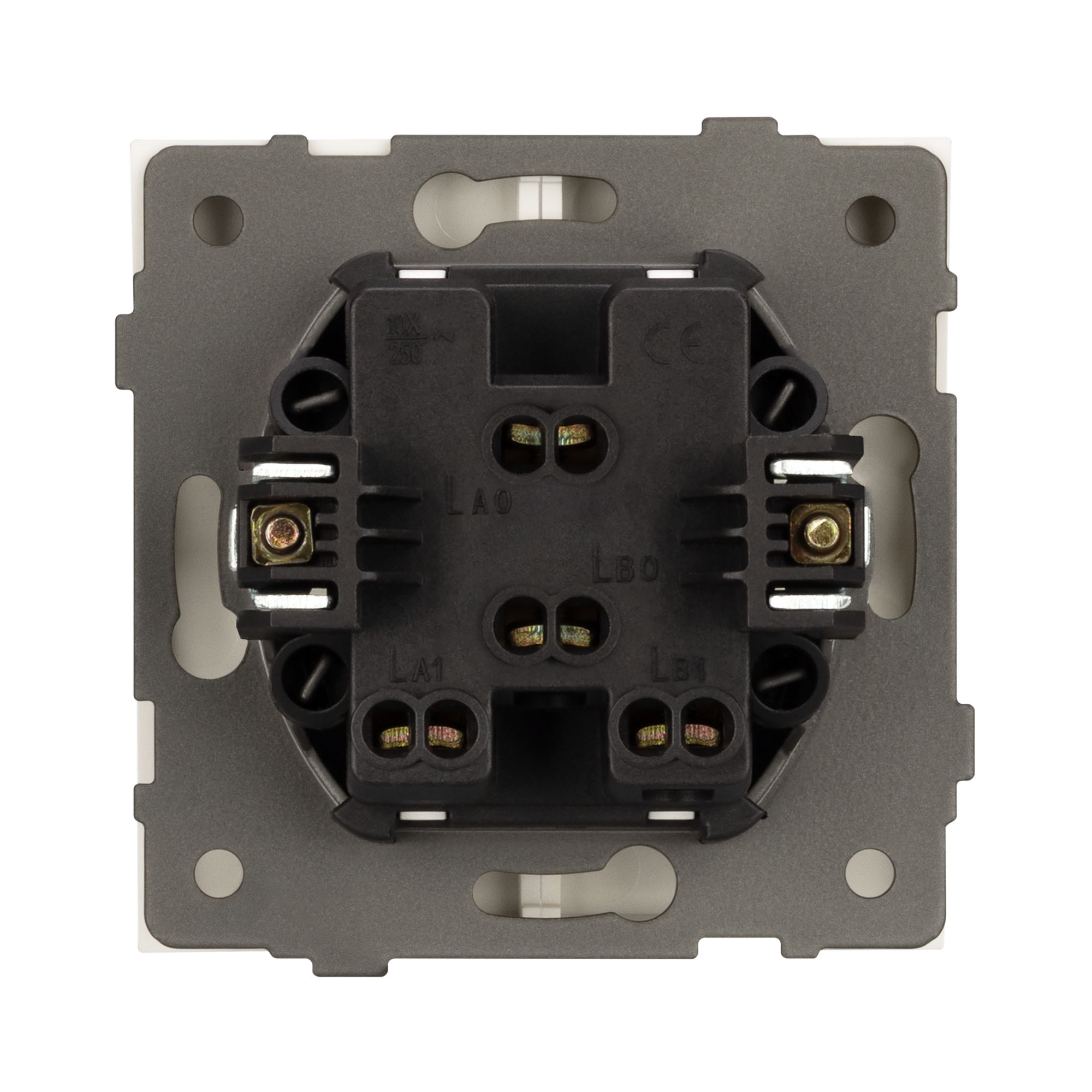 Механизм выключателя управления шторами на 1 пост 2 возвратные клавиши. Цвет - белый, с Soft-Touch покрытием. Без фронтальной рамки. Уровень пылевлагозащиты IP20. Выключатель устанавливается в стандартный подрозетник круглого сечения диаметром 60мм.
