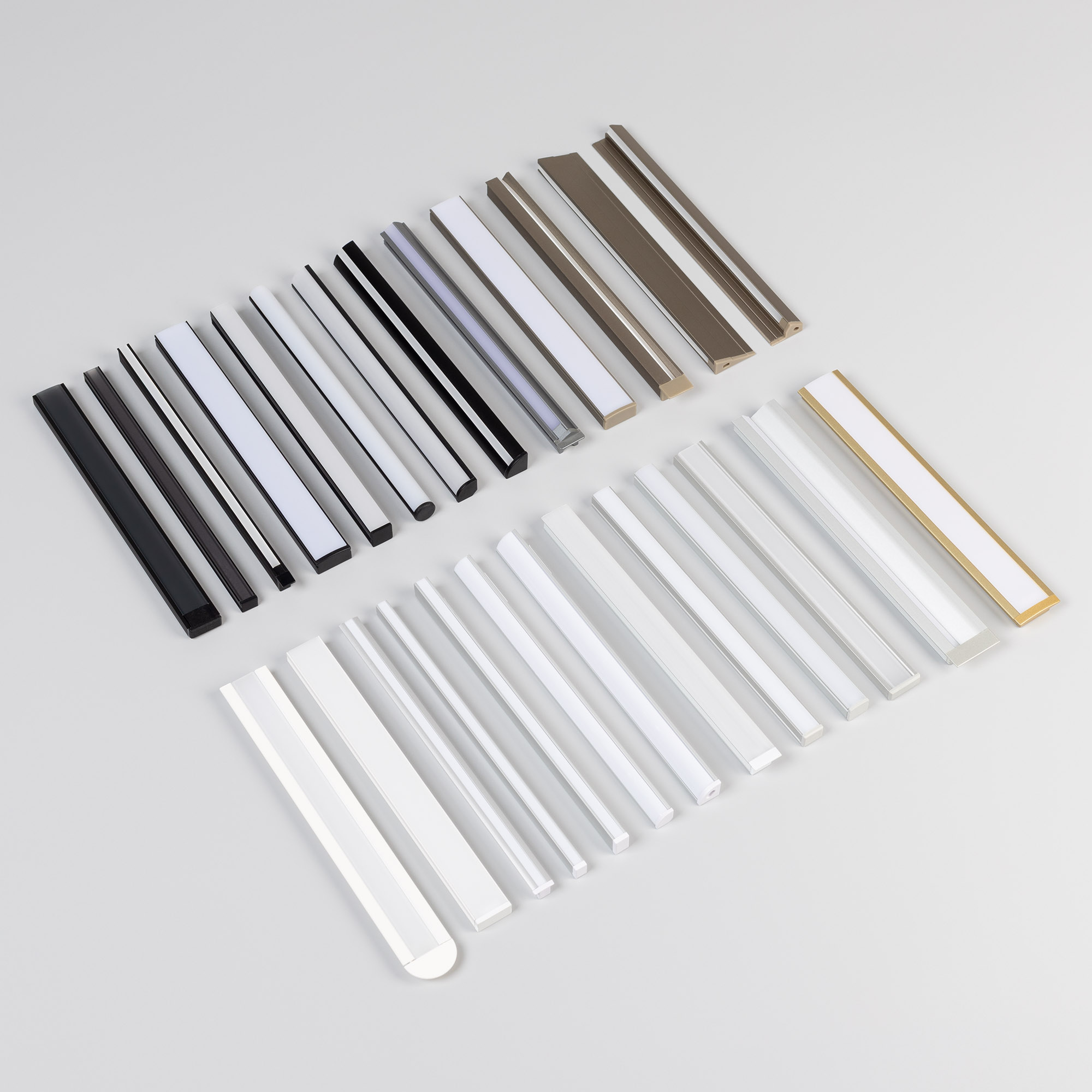 Набор образцов мебельных профилей ARLIGHT с экранами и заглушками.