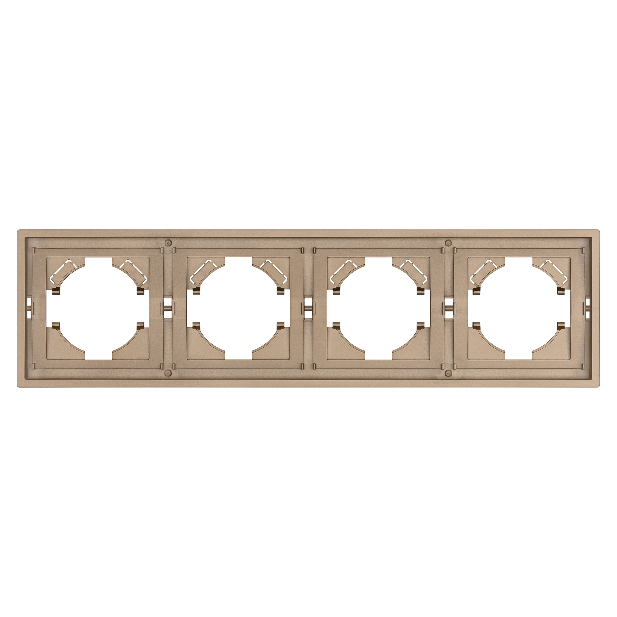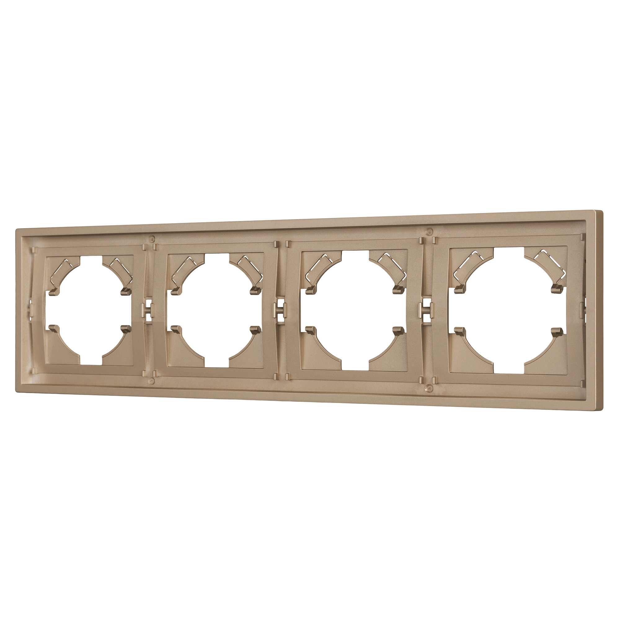 Рамка пластиковая на 4 поста, под встраиваемый механизм. Цвет - золотой. Среднего уровня герметичности IP20. Ориентация монтажа горизонтальная.