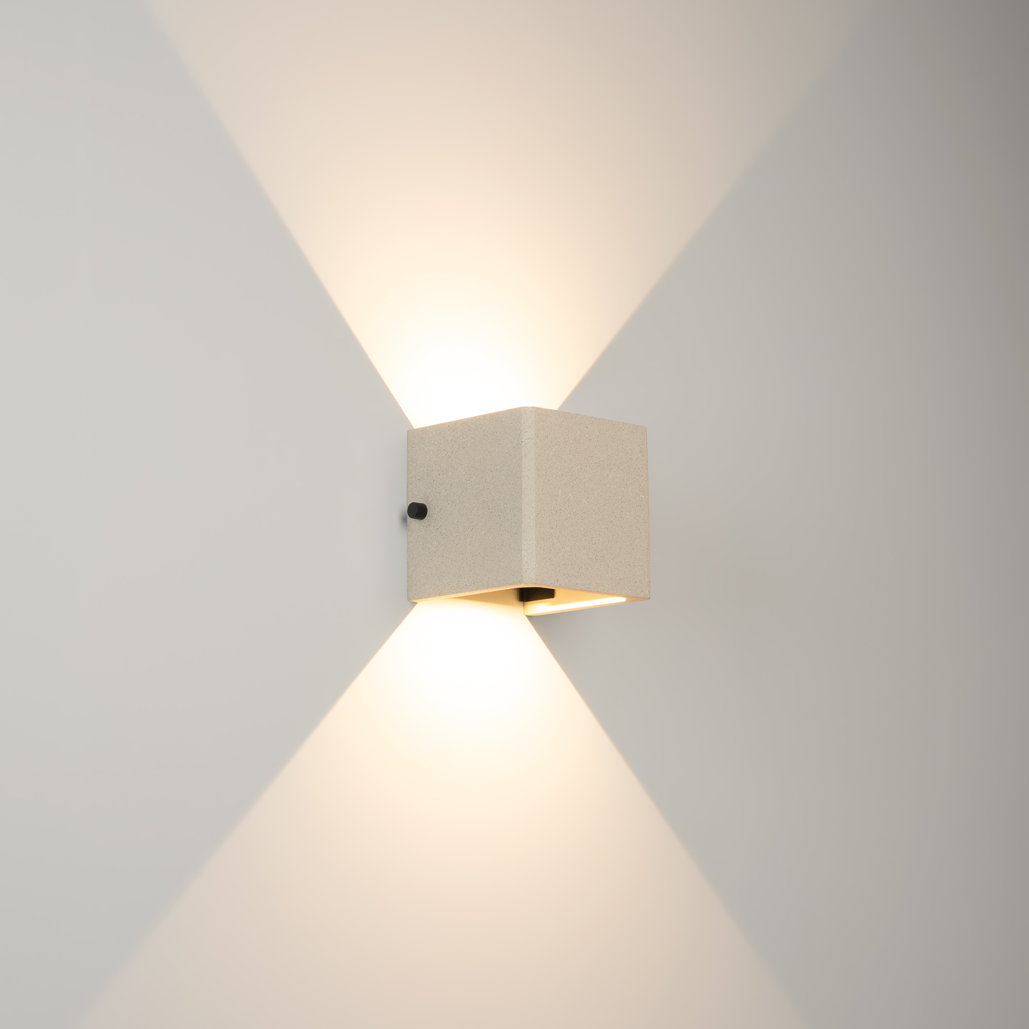 Накладной настенный светильник, свечение вверх/вниз. Мощность 6 Вт, св. поток 286 лм, 49 лм/Вт, теплый 3000 K, CRI>90, изменяемый угол освещения 0°-80°, напряжение питания 230 В. Фигурный корпус из бетона белого цвета и алюминия, экран ударопрочный PC, степень защиты IP65. Размер: длина 120 мм, ширина 120 мм, высота 120 мм. Монтаж накладной. Драйвер встроенный, пульсация <0.5%.