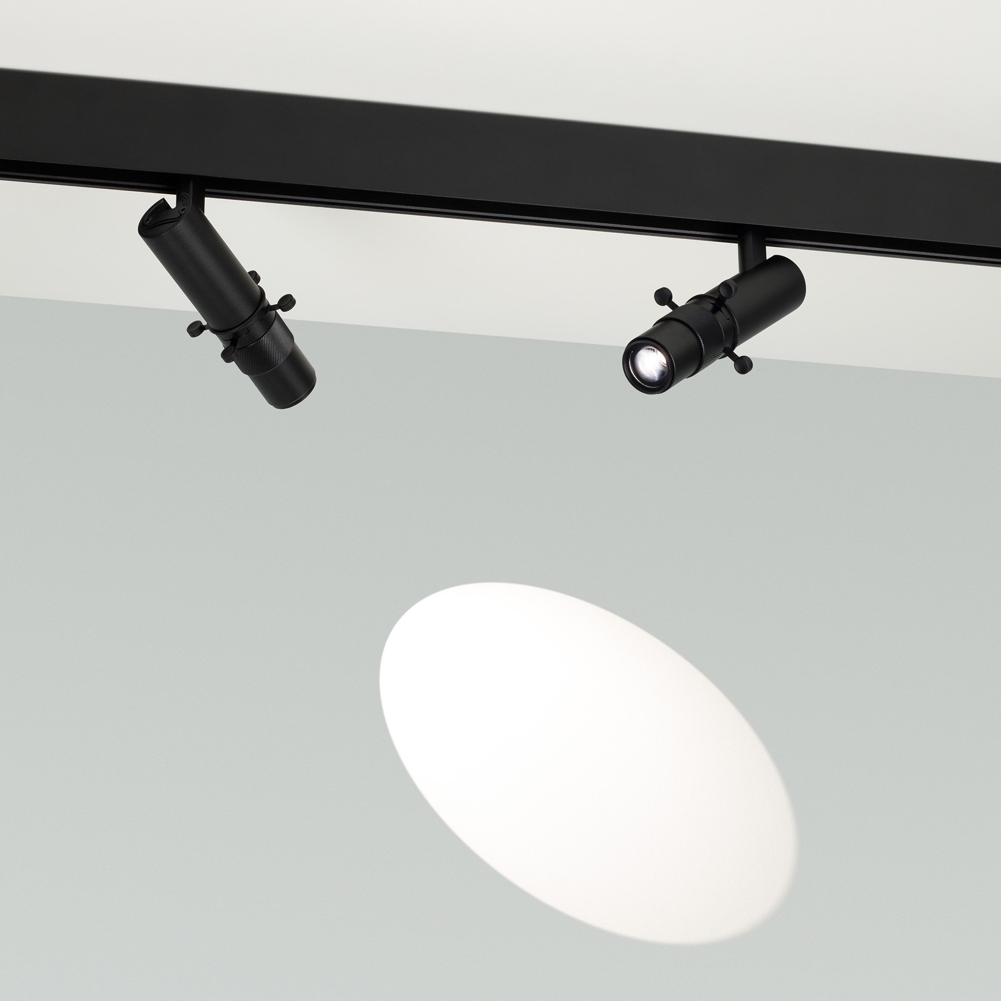 Светильник с кадрируемой оптикой и изменяемым углом для магнитных треков MAG-ORIENT шириной 26 мм. Мощность 6 Вт, св. поток 75-130 лм, 22 лм/Вт, дневной 4000 K, CRI>98, угол 19-29°, напряжение питания 48 В. Черный фигурный корпус из металла, степень защиты IP20. Размеры LxWxH 126x35x195 мм. Длина светоизлучающего модуля 140мм. Монтаж на трек MAG-ORIENT. Пульсация <1%.