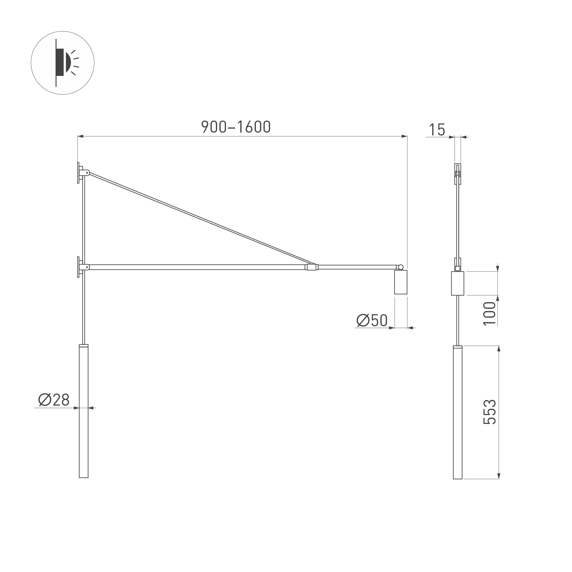 Настенный светильник. Мощность 6 Вт, св. поток 430 лм, 71 лм/Вт, цветовая температура 3000К, CRI>94, угол 36°, напряжение питания 230 В. Черный корпус из алюминия, степень защиты IP20. Размер светового модуля: диаметр плафона Ø50 мм, высота плафона 100 мм. Длина телескопической штанги - 1600mm. Размер противовеса: диаметр Ø28мм, длина 553мм. Монтаж настенный. Драйвер 2-10 В, 500 мА, пульсация <1%.